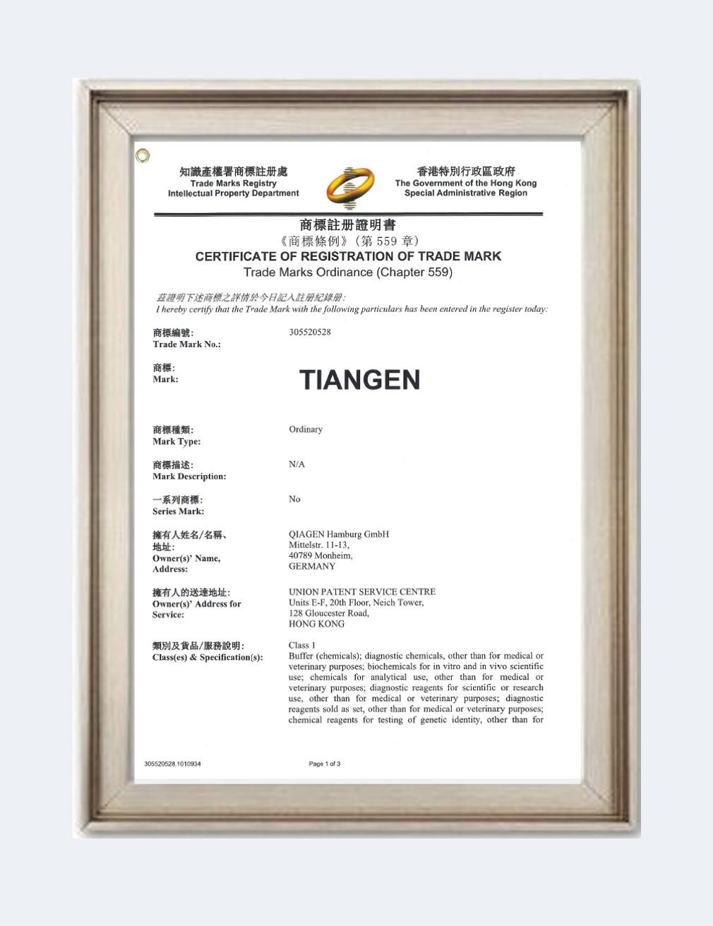 TIANGEN商标注册证书-中国香港