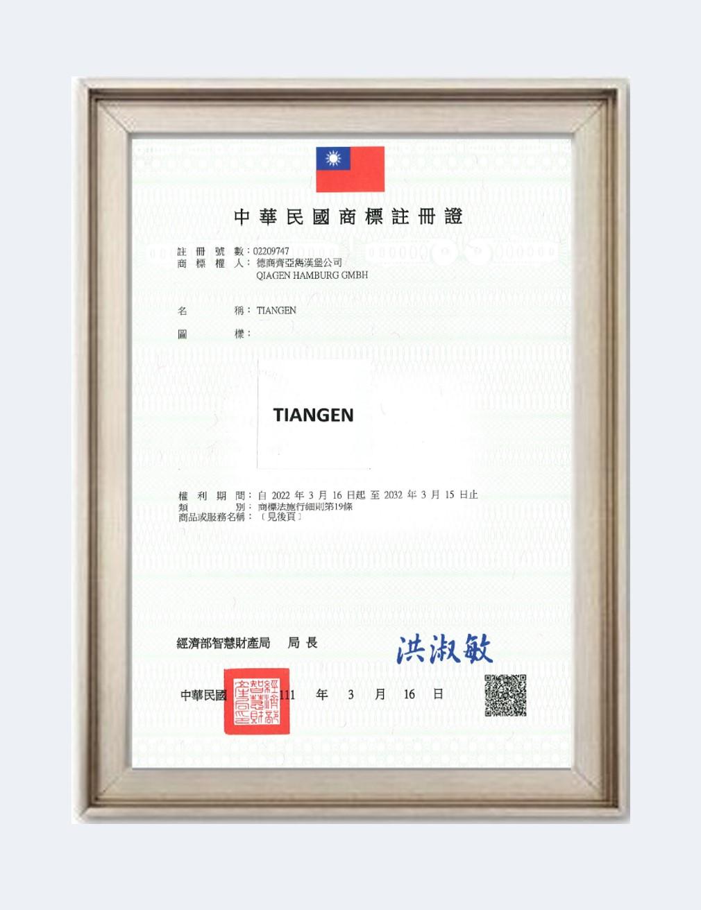 TIANGEN商标注册证书-中国台湾