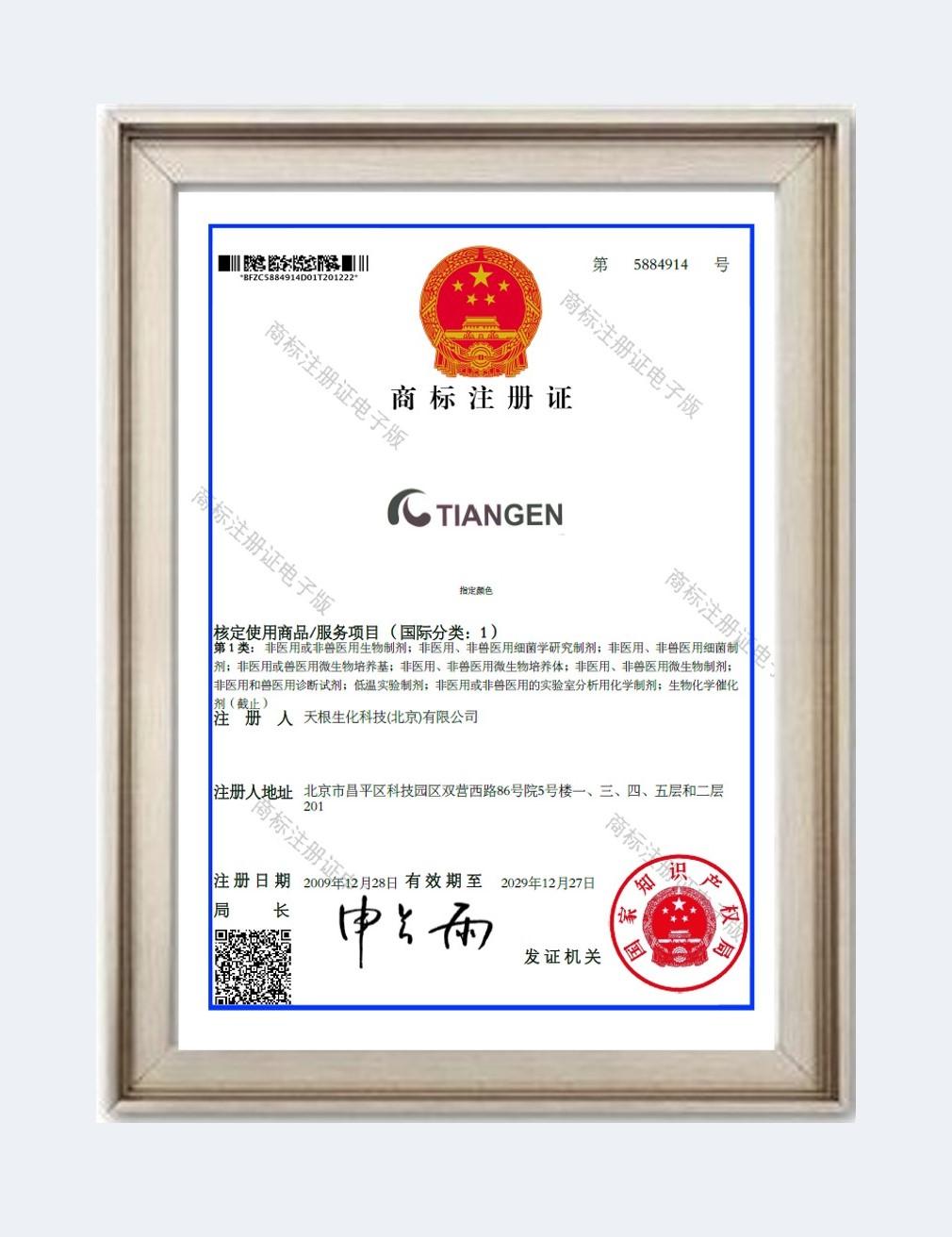 TIANGEN商标注册证书-中国