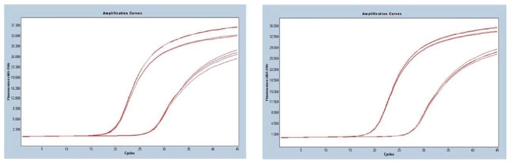 图2:qPCR 扩增曲线。左图:手工提取 右图:TEasy 自动化移液扩增人类GAPDH( 顶端曲线) 做4 个重复。2 μl cDNA 加入到18 μl Master mix 形成20 μl 体系。使用Roche LightCycler 480 实时荧光定量PCR 仪器和Super Read PreMix Plus(SYBR Green)(FP205)。结果显示,与手工提取相比,TEasy 自动化提取的精密度更高。