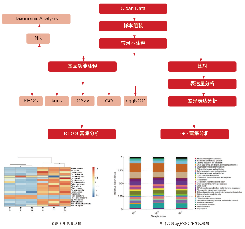 宏转录组(Metatranscriptome)是指从整体水平上研究某一特定环境,特定时期群体生命所有基因组转录情况以及转录调控规律的研究手段,它以生态环境中的全部RNA 为研究对象,避开了微生物分离培养困难的问题,能有效的扩展微生物资源的利用空间。相较于宏基因组,宏转录组能从转录水平研究复杂微生物群落变化,能更好的挖掘潜在的新基因。