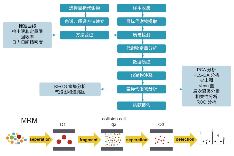 靶向代谢组学(Targeted Metabolomics)是针对想要研究的某一物质或某一类代谢物,以标准品为参照,利用多反应监测(MRM)技术对目标代谢物进行准确测定的方法。该方法能对生物机体中非靶向代谢组广泛筛查后的物质成分,进行准确的定性和定量分析,是对广靶分析的再次验证,其具有特异性强、灵敏度高、定量准确的特点。近几年,提出了一种整合了非靶向代谢组“广泛性”和靶向代谢组“准确性”检测技术优点的新型代谢组检测技术――广泛靶向/ 类靶向代谢组学(Widely-targeted metabolomics),基于各公司的自建库,可一次性定性定量检测近千种代谢物。