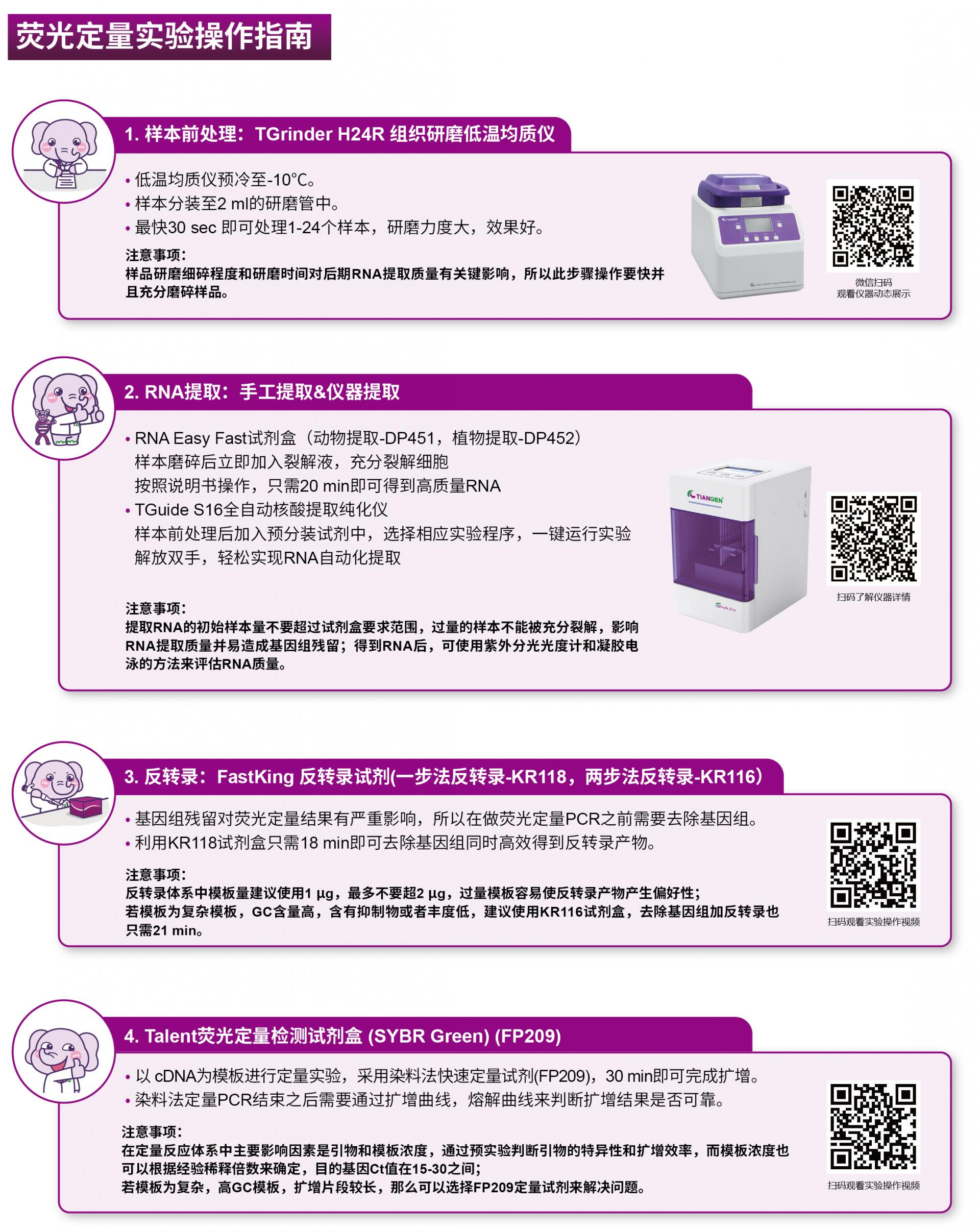 在RT-qPCR领域,TIANGEN不仅开发了各具特色的反转、定量试剂,还在全国范围内开展了数百场的荧光定量实验讲训班,提供从原理到实操的技术培训。针对GC含量高、二级结构复杂、抑制剂残留样本的定量,我们也开发了普适性更广、抗逆性更强、灵敏度更高产品,成就更优秀的定量结果。