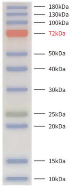 本产品含有11种预染的蛋白质分子量标准,分子量范围为10-180 kDa,分子量大小分别为180 kDa,130 kDa,100 kDa,72 kDa,50 kDa,40 kDa,30kDa,25 kDa,20 kDa,15 kDa,10 kDa,其中25kDa条带为绿色,72 kDa条带为橙红色。三色预染蛋白质Marker可以直接观察并判断蛋白电泳及WesternBlot转膜的效果。该产品含SDS,不适合用于非变性胶。